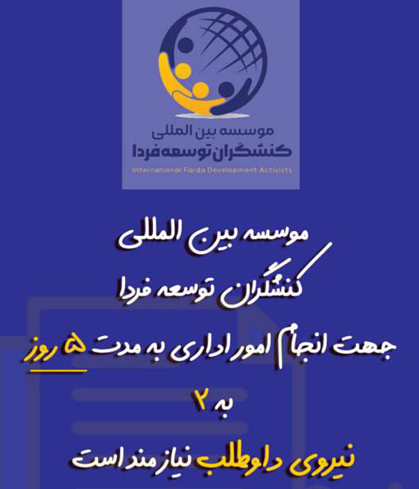 فراخوان جذب دو نیروی داوطلب در استان تهرانAdminآگوست 17, 2024موسسه بین المللی کنشگران توسعه فردا جهت انجام امور اداری به مدت 5 روز به دو نیروی داوطلب نیازمند است. شما میتوانید رزومه خود ... ادامه مطلب